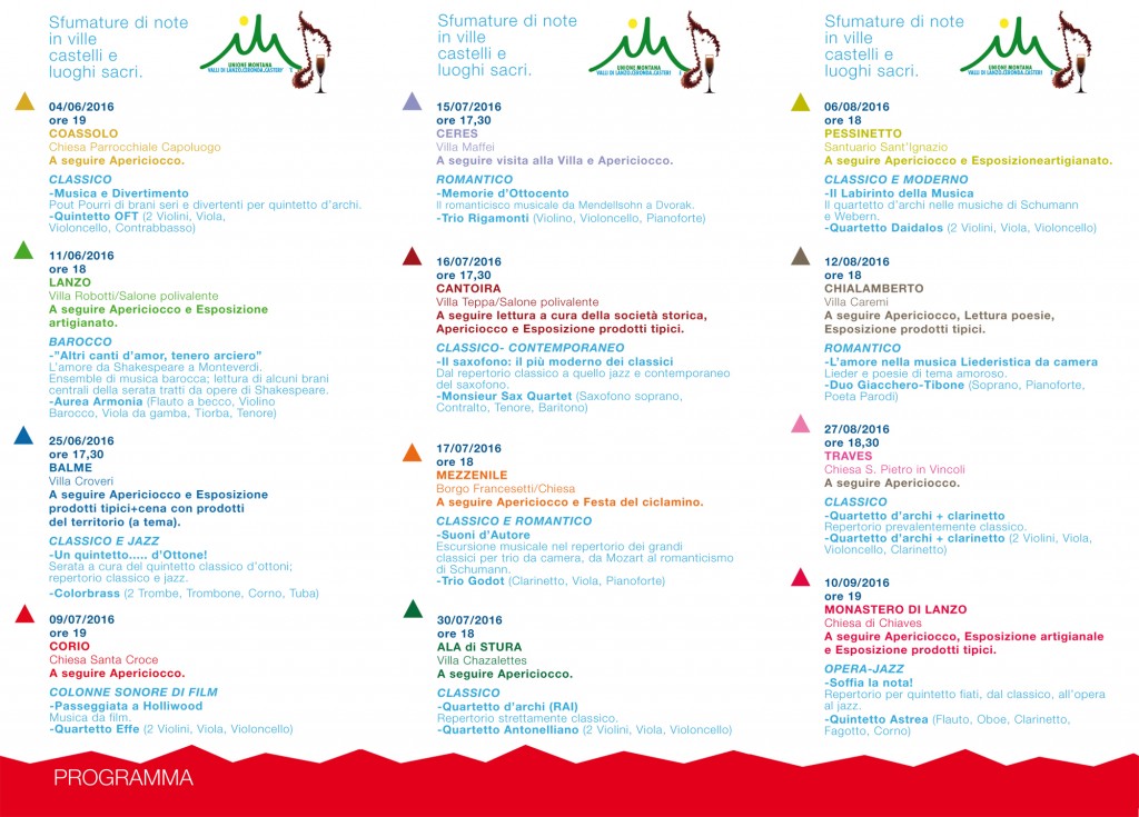 Solo singers, dancers and cultural lectures, promoted by the Lanzo Valleys historic Society, will also support the various concerts. Side events will be related to the valley characteristic: taste itineraries and exhibit areas, so as to satisfy all customers. The visit to the historical villa will enable visitors to see the most significant rooms and receive correct information about the place.